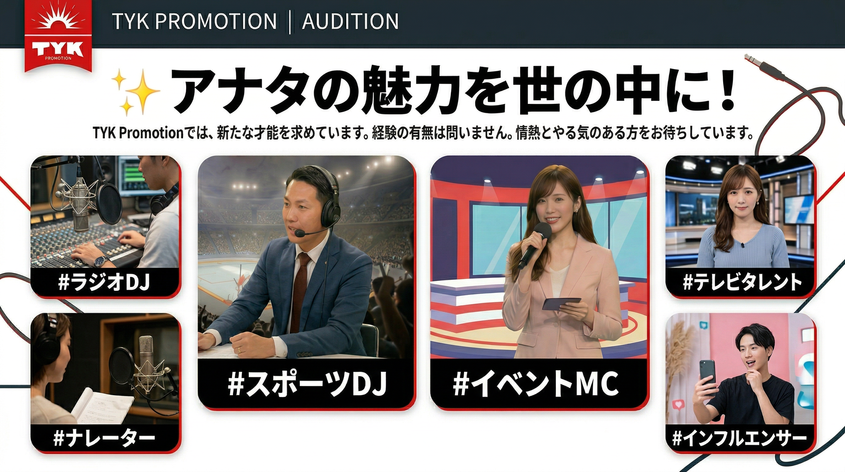 TYK Promotionでは、新たな才能を求めています。経験の有無は問いません。情熱とやる気のある方をお待ちしています。